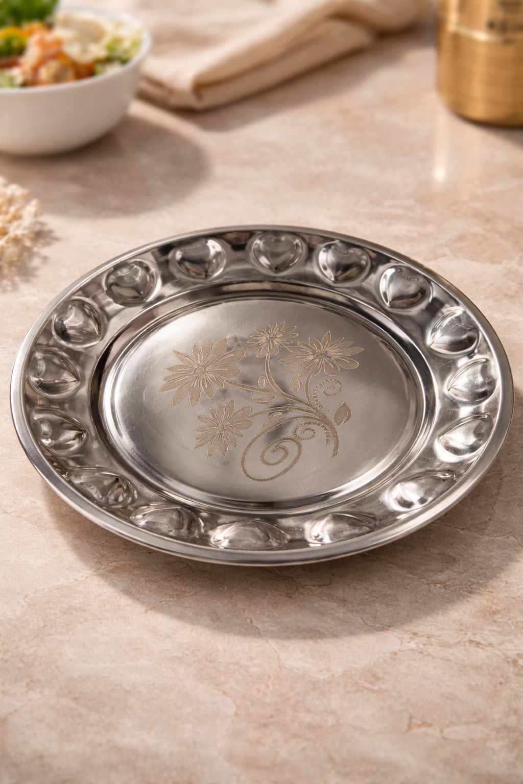 Crafted with a sleek floral engraved design and mirror-like shine, these plates instantly elevate your dining experience — giving your home that premium hotel-style feel without spending extra. Whether it’s serving hot rotis, evening snacks, or breakfast, these plates fit effortlessly into your daily routine.