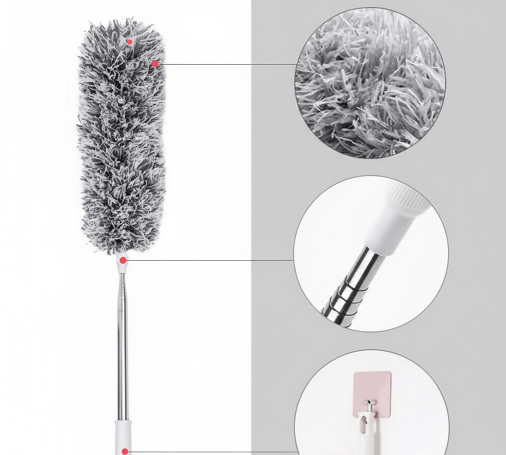 This is not just a regular duster. It is a thoughtfully designed ceiling fan and light cleaning tool that removes dust from hard-to-reach areas without using a ladder. The adjustable pole extends up to 95 inches, allowing you to clean ceiling fans, tube lights, corners, and high shelves while standing safely on the floor. This makes it an ideal choice for senior citizens and anyone who wants a safer cleaning routine.